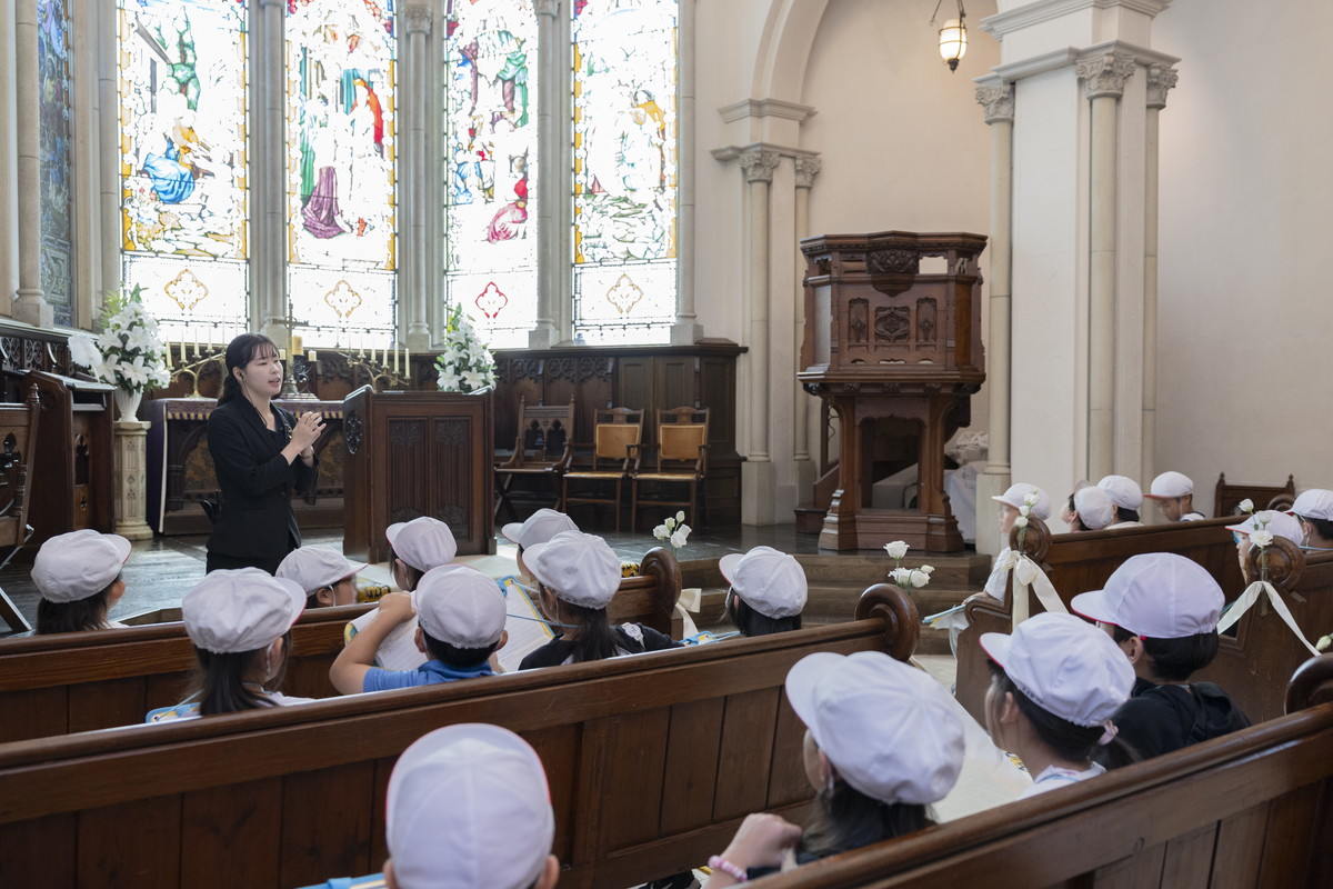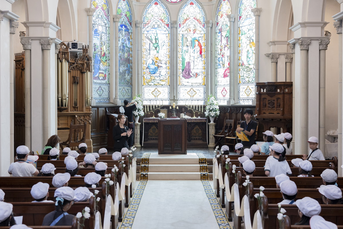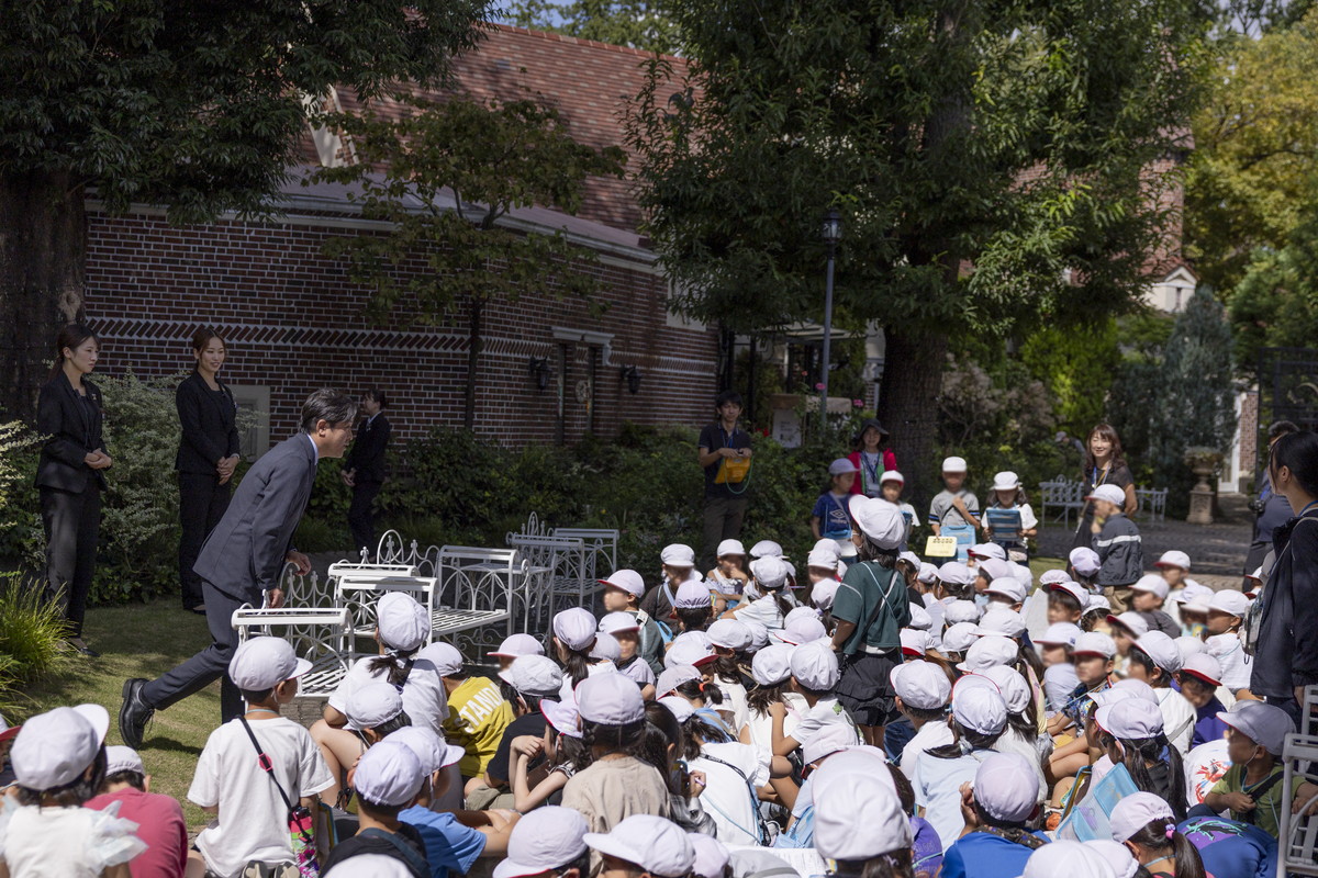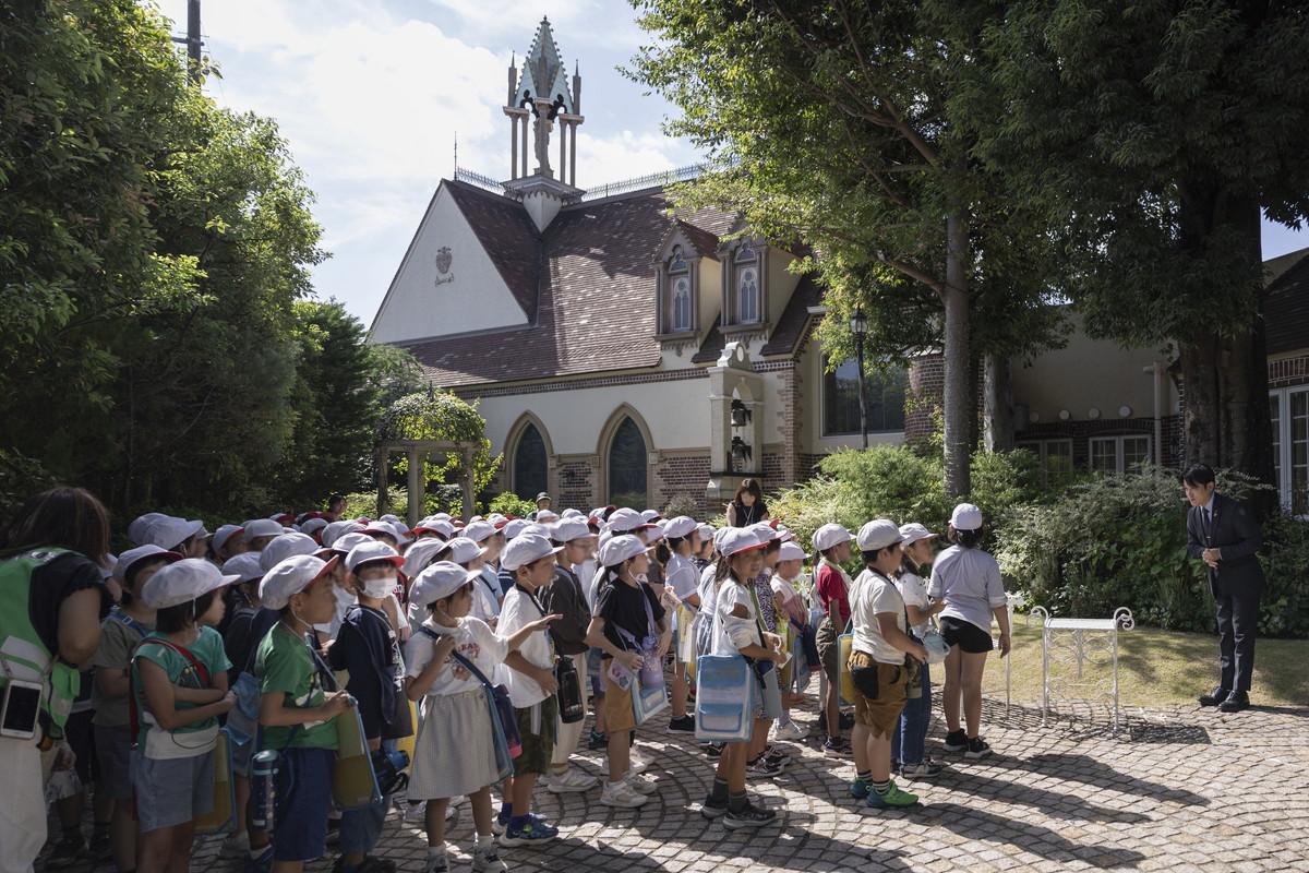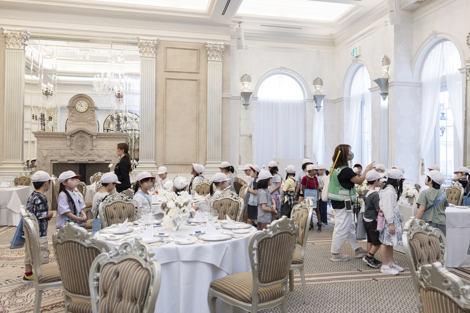 当日は元気いっぱいの子どもたちが来館し、チャペルや披露宴会場、ガーデンなどを見学しながら「ここではどんなお仕事をしているんですか?」「結婚式って何をするところですか?」と、たくさんの質問を投げかけてくれました。スタッフも一つひとつに答えながら、結婚式という仕事の魅力や、式場で働く人々の役割をお伝えしました。