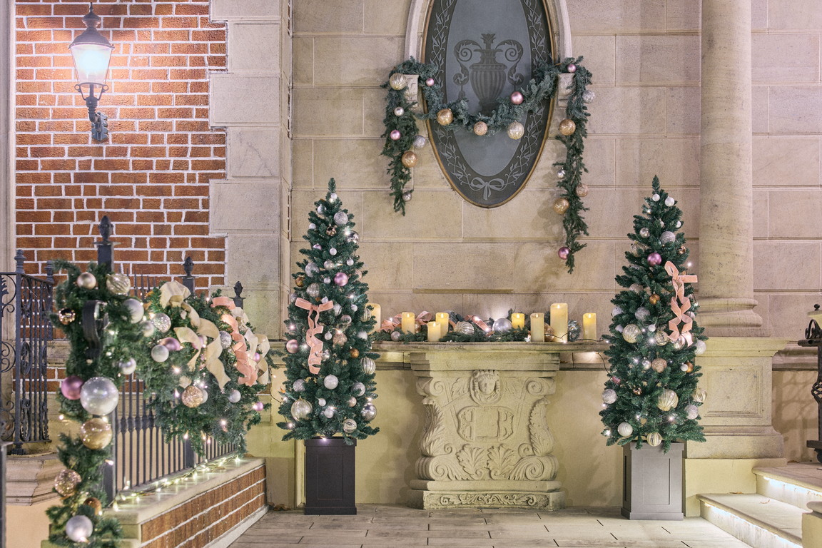 英国邸宅の世界観に寄り添うアンティーク調のオーナメントやクラシックツリーに加え、
